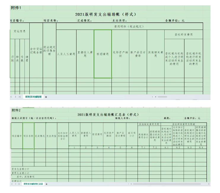 财税〔2015〕119号文件规定,对享受加计扣除的研发费用按研发项目设置辅助账,准确归集核算当年可加计扣除的各项研发费用实际发生额。税务部门分别于2015、2021年发布了两版辅助账样式,企业可根据自身实际情况,参照适用的辅助账样式设置辅助账,或可以自行设计研发支出辅助账样式。